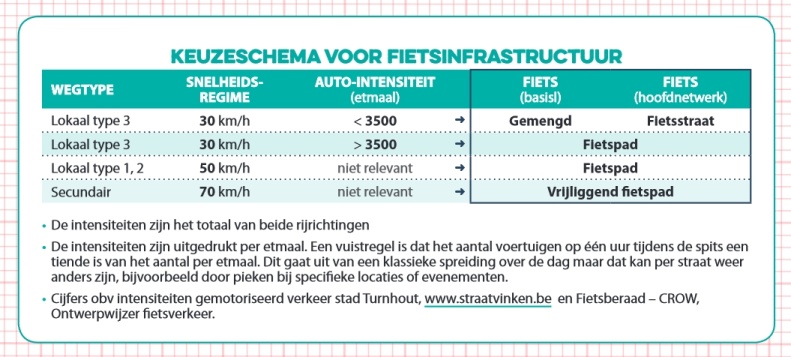 Fietsberaad - het kenniscentrum voor fietsbeleid in Vlaanderen - publiceerde onlangs een keuzeschema voor fietsinfrastructuur (te vinden op deze link - pagina 22). Voor zone 30 is gemengd verkeer haalbaar tot een maximale intensiteit van 3500 auto's per dag (of 350 auto's tijdens een uur in de spits). Bij hogere intensiteiten of hoger snelheden is een fietspad nodig. Als we die leidraad volgen, blijkt de fietsinfrastructuur in straattype A (steenweg), C en D te voldoen. Maar voor straattype B is de gemeten intensiteit bijna 50% hoger dan de aanbevolen maximale intensiteit.