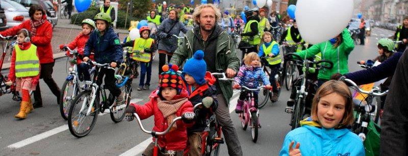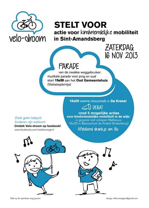 Tijdens een feestelijke parade reden 400 fietsers, voetgangers, skateboarders, rolschaatsers door de straten van Sint-Amandsberg en vroegen aandacht voor de weg naar school. Achteraf volgde er een presentatie van de actiepunten van Velodroom en een debat met Filip Watteeuw (schepen van mobiliteit), Pieter Deschamps (Fiets van Troje) en .